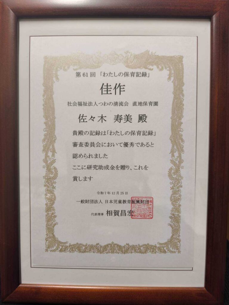 一般財団法人日本児童教育振興財団が主催する「わたしの保育記録」において、直地保育園の佐々木寿美園長の記録が「佳作」を受賞いたしました。